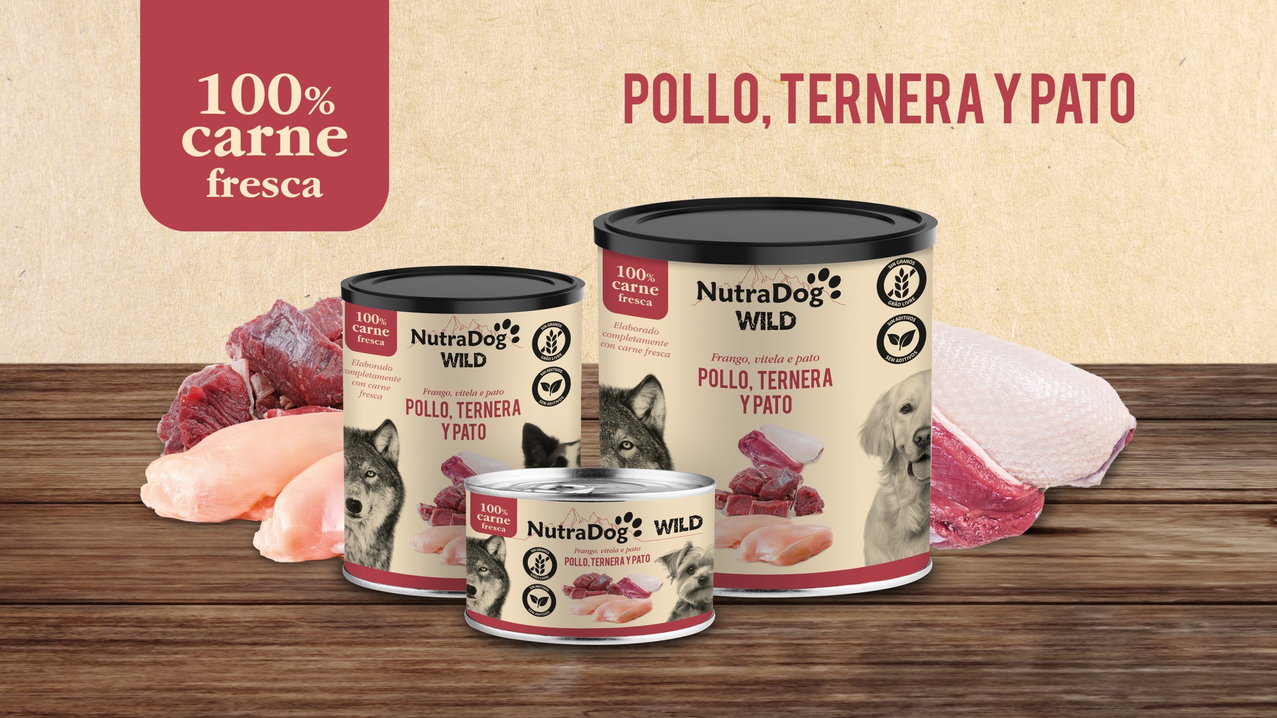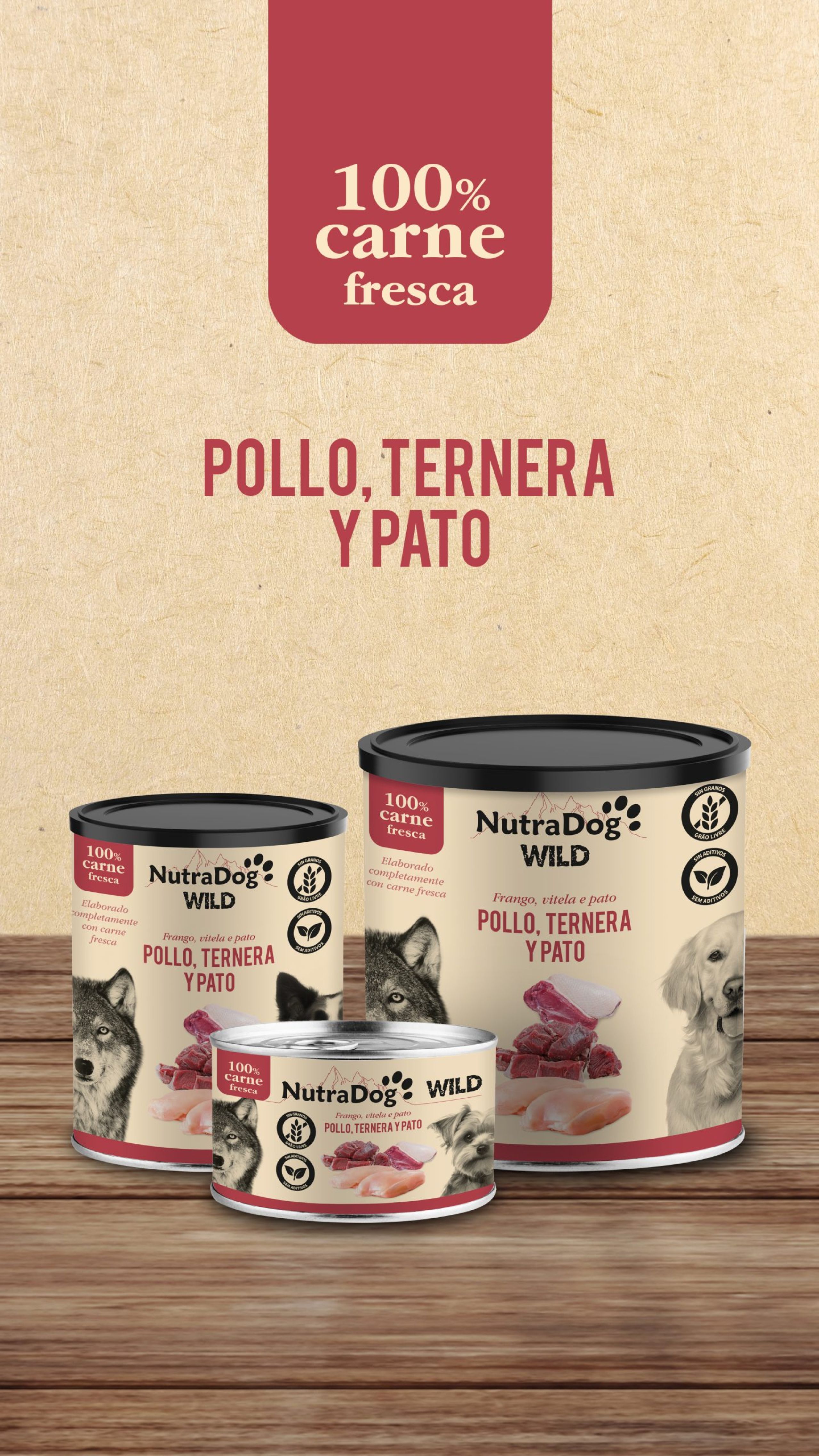 NutraDog WILD húmedo Pollo, Ternera y Pato es una receta equilibrada, sabrosa y altamente palatable, gracias a la fusión de estas tres carnes seleccionadas. Es la opción perfecta para perros que disfrutan de sabores variados y diferentes texturas sin renunciar a una nutrición de calidad.