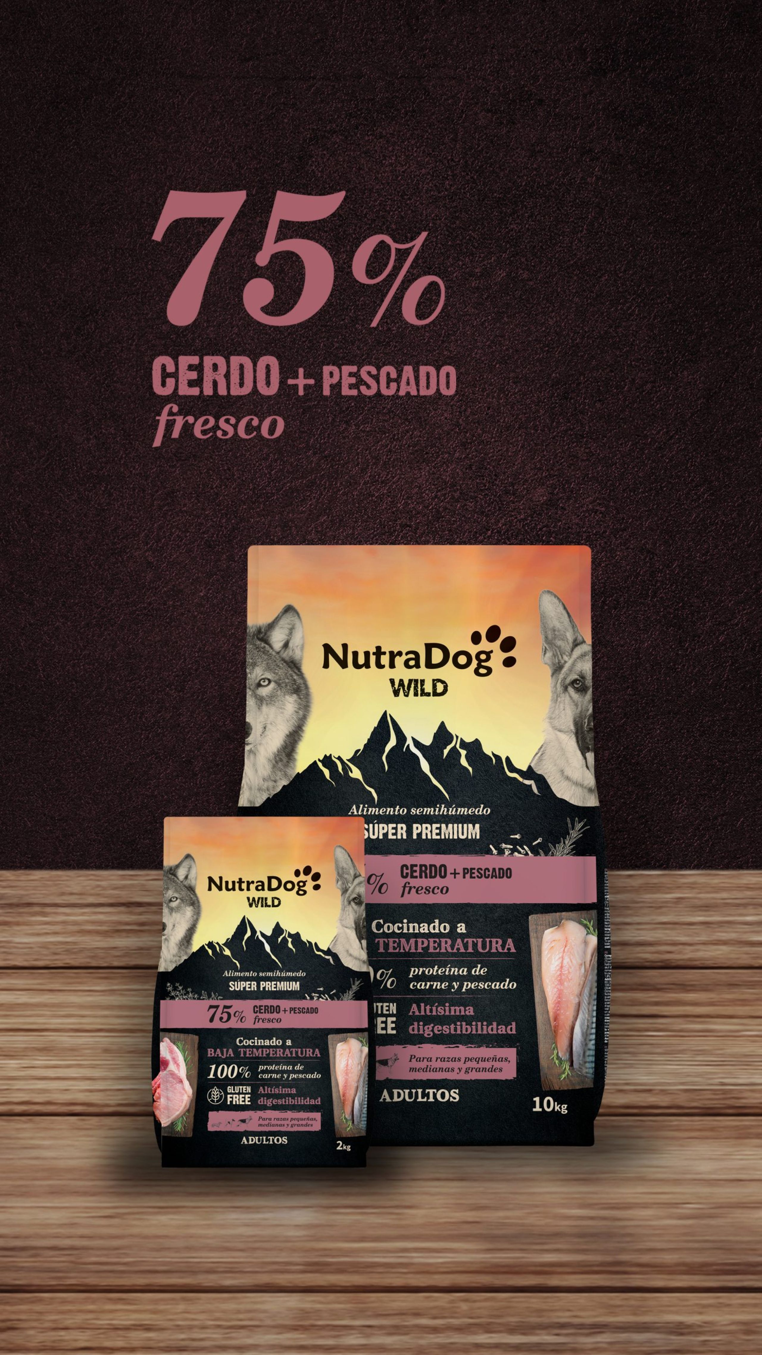 NutraDog WILD 75% Cerdo + Pescado proporciona nutrición y sabor en cada bocado gracias al uso de proteínas menos convencionales como el cerdo, junto a proteínas con carácter hipoalergénico como la del pescado. Esta variedad es ideal para perros con intolerancias o alergias a proteínas comunes como el pollo o la ternera.