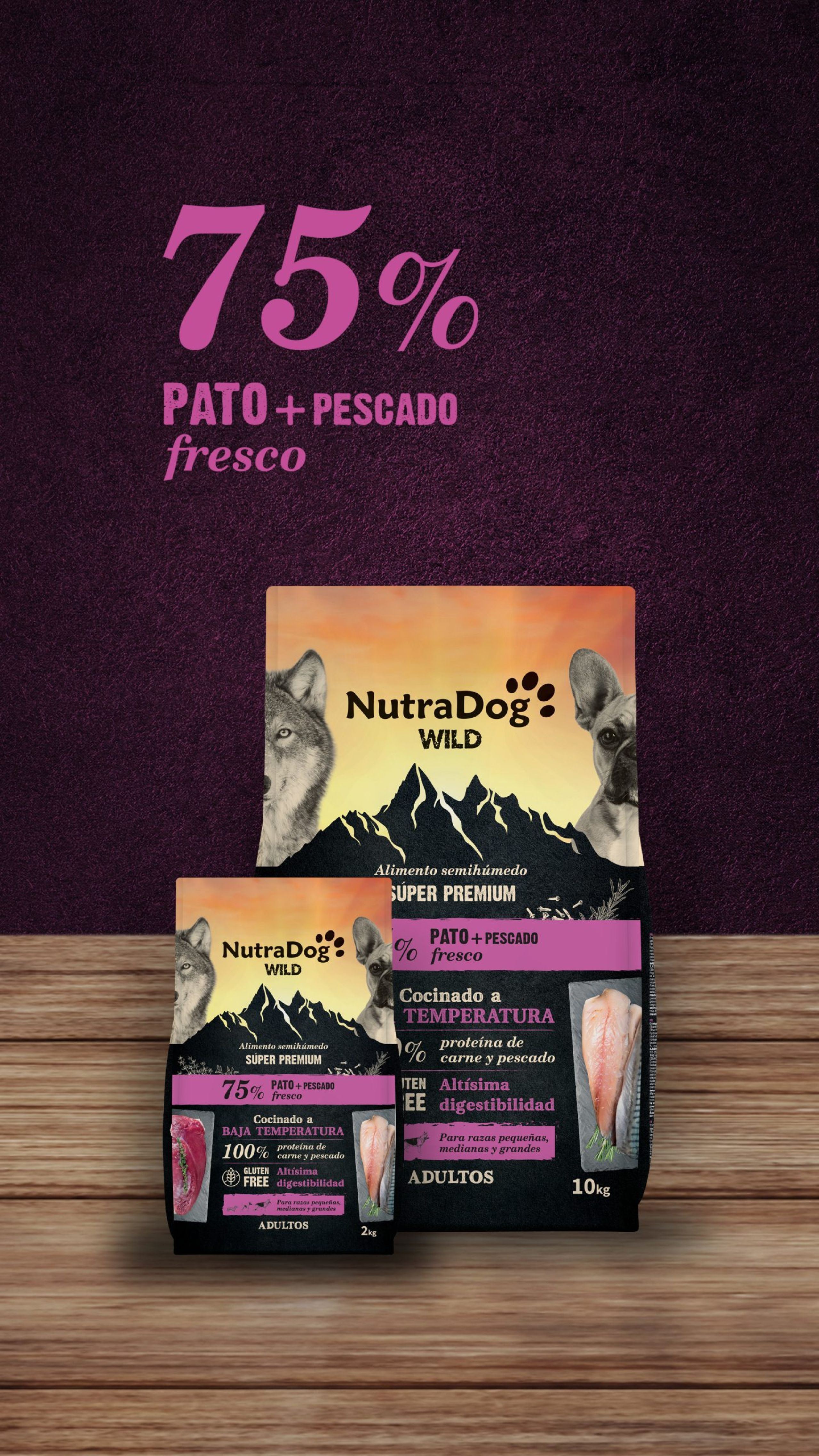 NutraDog WILD 75% Pato + Pescado ofrece un sabor premium con un contenido calórico de 3.842 Kcal/kg, a base de proteína completa y grasas saludables. Sus ingredientes, de alta digestibilidad, lo hacen ideal para todas las razas y especialmente para perros con digestiones lentas o estómagos sensibles, como el Bulldog Francés, Bulldog Inglés, Gran Danés, San Bernardo o Pastor Alemán.