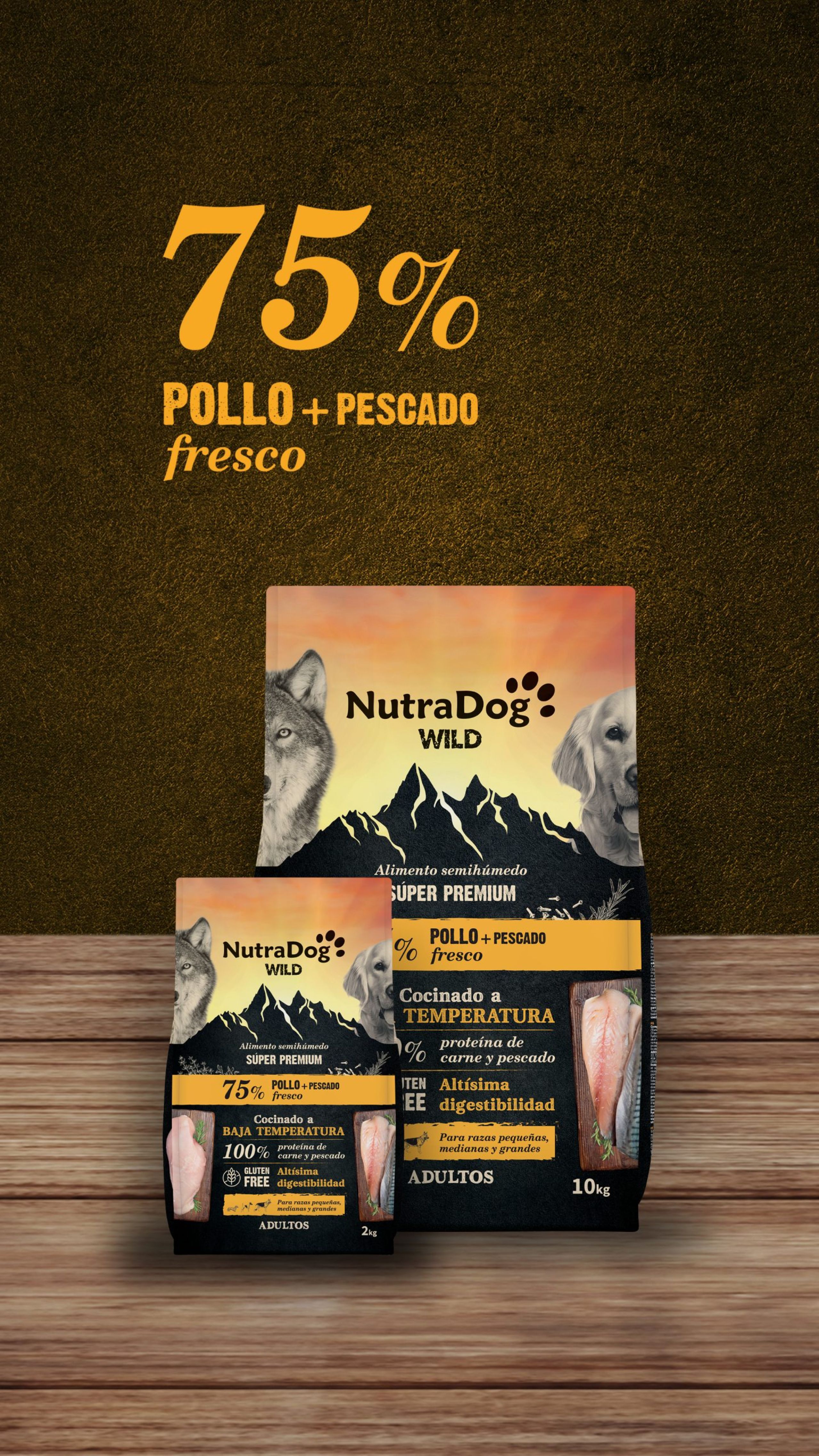 NutraDog WILD 75% Pollo + Pescado está elaborado con ingredientes de alta calidad proteica y un contenido de grasa moderado. Su aporte calórico de 3.868 Kcal/kg lo convierte en una comida nutritiva y saciante, ideal para perros de todas las razas, pero especialmente para aquellas con predisposición al sobrepeso, como Labrador, Golden Retriever, Dachshund (Teckel), Beagle, Cocker Spaniel o Bulldog Francés.