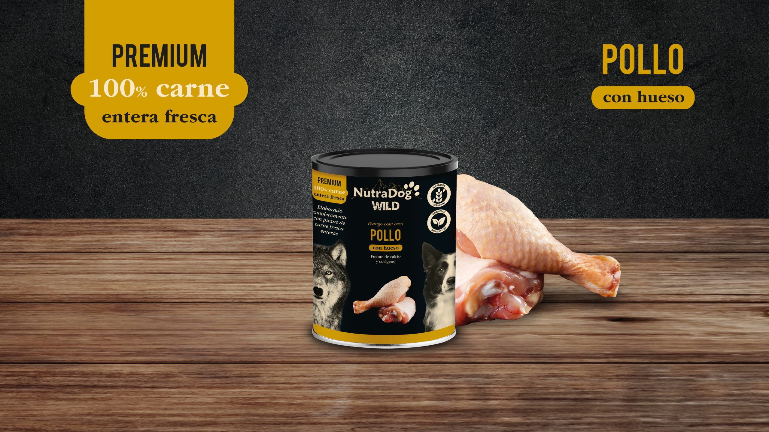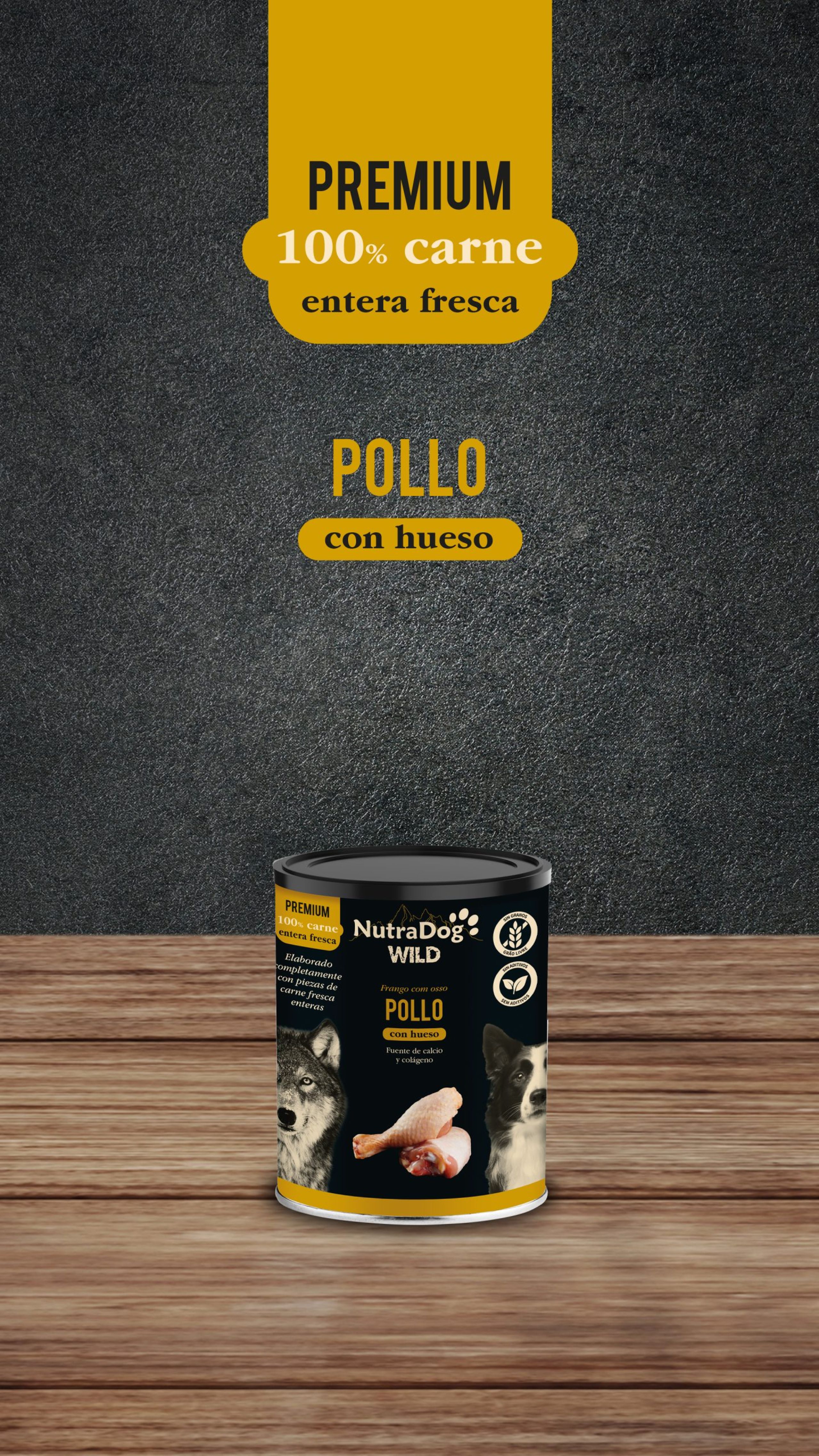 NutraDog WILD húmedo Pollo con Hueso Premium es un alimento húmedo complementario para perros, elaborado únicamente con carne de pollo 100% fresca. Esta versión premium utiliza piezas enteras de pollo, con sus huesos, cortadas y enlatadas a mano, garantizando la máxima calidad y un sabor inigualable.